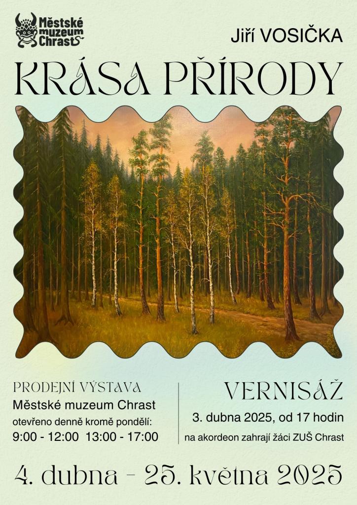 Městské muzeum Chrast pořádá 3. dubna 2025 od 17 hodin vernisáž prodejní výstavy "Krása přírody". Návštěvníci se mohou těšit na hudební vystoupení žáků ZUŠ Chrast. Výstava bude otevřena denně kromě pondělí od 9 do 12 a od 13 do 17 hodin.